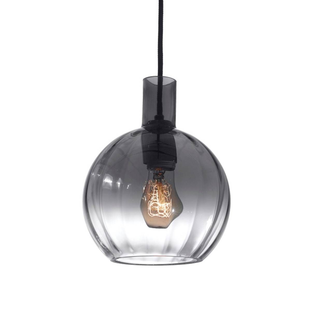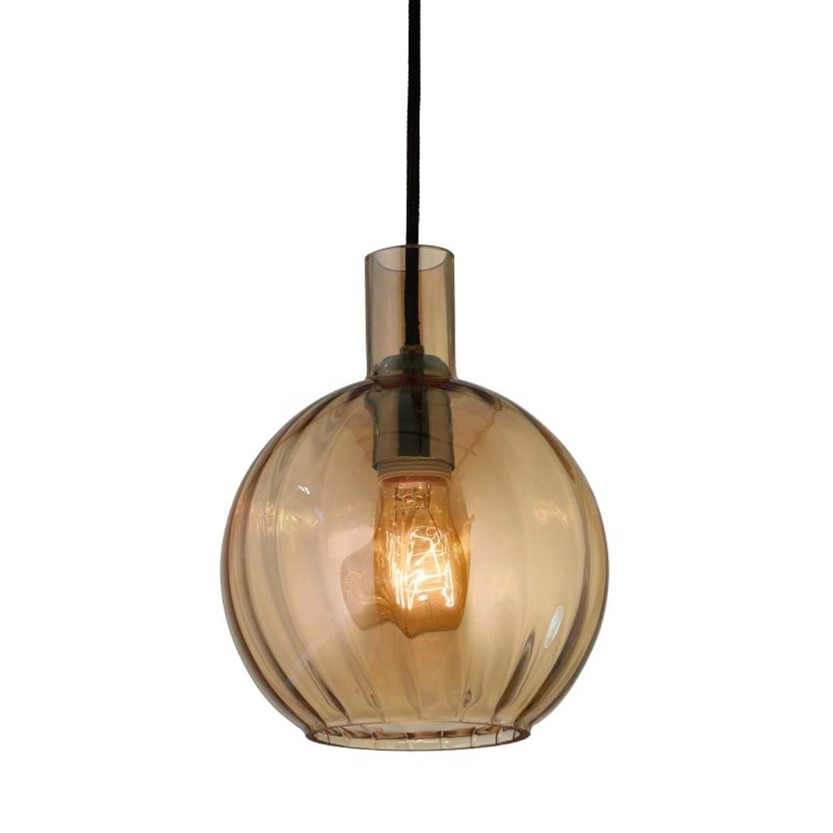 Confeccionado en vidrio color ámbar o smoke (fumé). El capuchón que contiene el portalámparas es metálico color cromo (vidrio smoke) o cobre (vidrio ámbar). Equipado con portalámparas de rosca común (E27). Sugerimos el uso de lámparas estilo vintage filamento 220V 8W. Alcanza un diámetro de 19 cm y una altura de 24 cm.