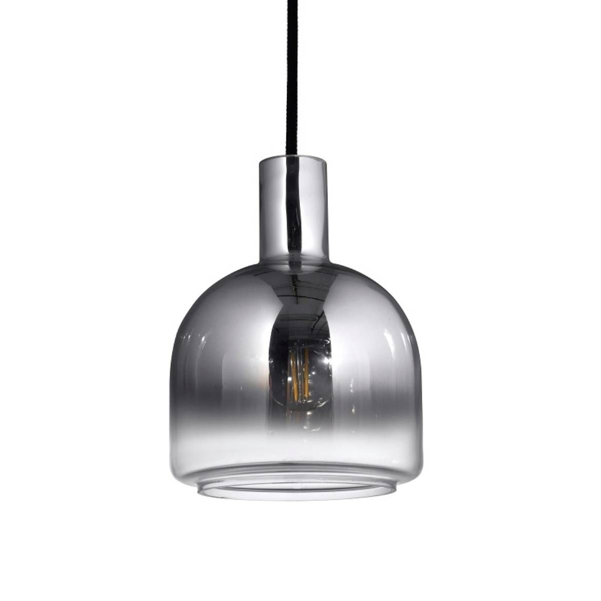 Fabricado en vidrio color cromo o cobreen degrade. Provisto de portalámparas de rosca común (E27). Sugerimos el uso de lámpara led filamento 220V 8W. Sus medidas: 15 cm de diámetro y 20 cm de altura.